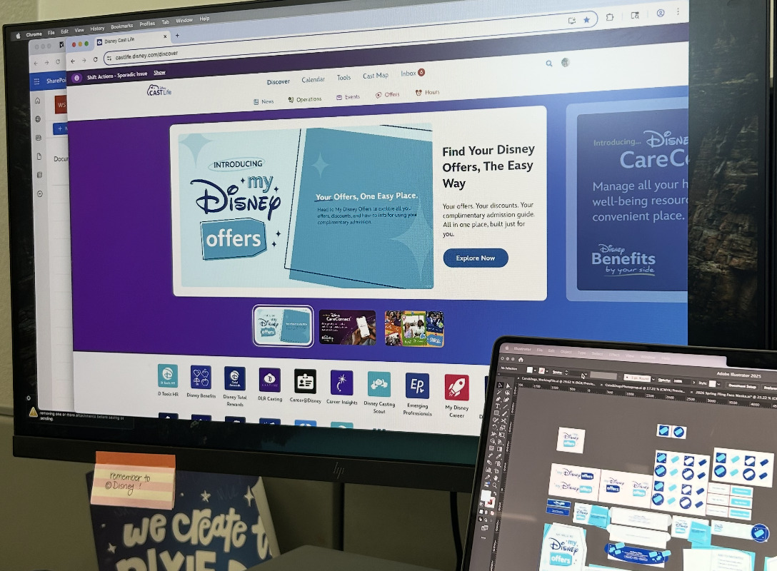 Creating the brand for My Disney Offers was such an exciting project! I aimed to make the design feel cohesive with MyDisneyToday while also highlighting the magic of Disney Offers. In addition to developing the brand, I created a variety of assets, including Cast TV slides, news posts, article headers, Teams backgrounds, email headers and footers, a style guide, and more as requested. Seeing my designs featured on the front of Disney Cast Life was such a surreal moment. I’m so grateful for the opportunity to make an impact on Cast Members!